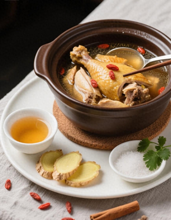 冬吃萝卜夏吃姜,立秋后迟早渐凉,正是用生姜温阳的好时机。这道姜酒鸡将客家传统与江南风味交融:土鸡斩块焯水去血沫,砂锅爆香姜片至微焦,下鸡块翻炒至金黄,淋入半碗陈年黄酒激起香气,加开水没过食材,文火慢炖40分钟。出锅前撒把枸杞,汤色金黄如琥珀,姜的辛香与酒的浑厚交错,喝一碗从胃暖到脚底,特别合适空调房久坐的上班族。