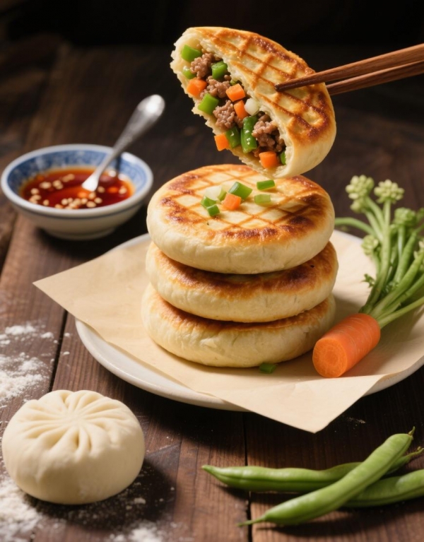 老话讲立秋贴秋膘,但现代人养分过剩,盲目大鱼大肉反而伤脾胃。这道煎饼将时令豇豆与低脂牛肉完美结合:豇豆焯水切丁,牛肉馅用酱油、胡椒粉腌入味,胡萝卜碎增甜,葱姜末提香。面团选用半烫面工艺--200ml开水烫面添加柔软度,100ml冷水揉面坚持筋道,醒发30分钟后包入馅料,平底锅薄油煎至双面金黄。咬开酥脆外皮,内馅多汁鲜香,既满意贴膘需求,又防止油腻。