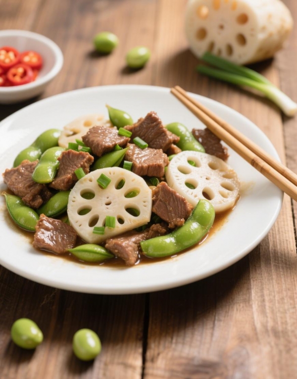 立秋后空气渐燥,莲藕正是当季水中人参。选九孔莲藕切薄片,毛豆剥壳焯水去豆腥,牛肉用淀粉、生抽抓匀锁住汁水。热锅冷圆滑炒牛肉至变色盛出,留底油爆香蒜片,下毛豆莲藕快炒,最终回锅牛肉,淋少量蚝油提鲜。藕片脆爽带甜,毛豆粉糯,牛肉滑嫩,三色交错如秋日画卷,清补不上火。